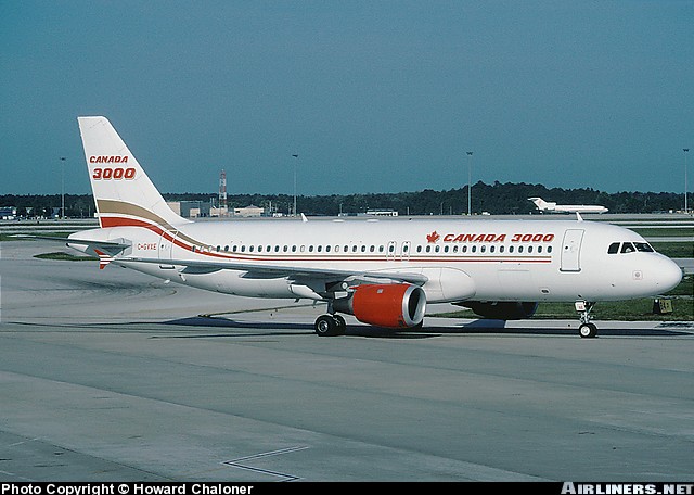 Canada 3000 Airbus A320-212, C-GVXE, is shown at Orlando International Airport on April 22, 2000.