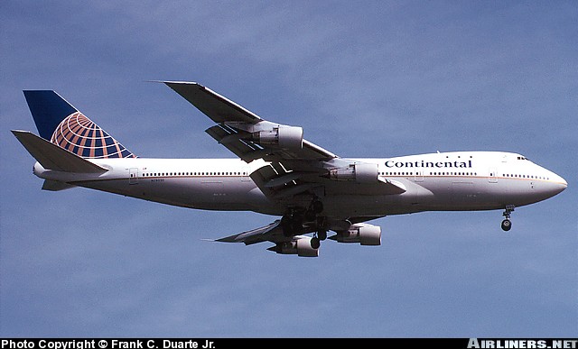 Continental Airlines Boeing 747-243B, N78020, is shown at Frankfurt, Germany in July 1993 wearing Continental's