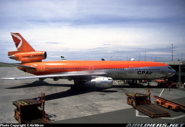 CP Air McDonnell Douglas DC-10-10, N1834U, is shown at Vancouver in June 1986.