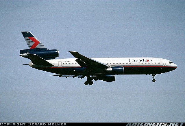Canadian Airlines International McDonnell Douglas DC-10-30, C-GCPI, is shown arriving at Frankfurt in the mid-1990s.