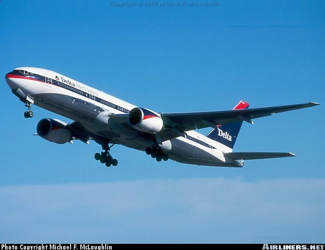 Delta Air Lines Boeing 777-232, N866DA, is shown departing Kennedy International Airport in June 2000.