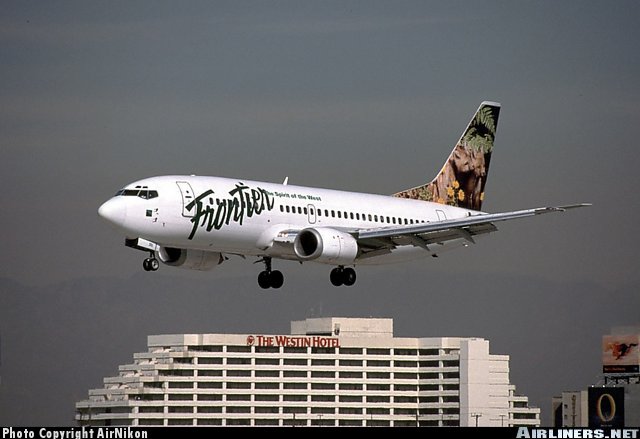 Frontier Airlines Boeing 737-301, N578US, is shown arriving at Los Angeles in February 1999.