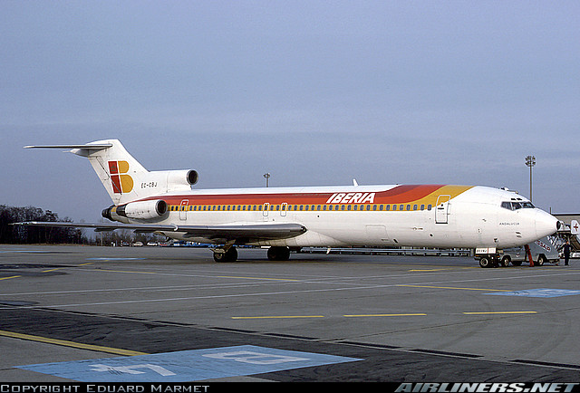 Iberia Boeing 727-256, EC-CBJ, "Andalucia," is shown at Basle/Mulhouse in January 1985.