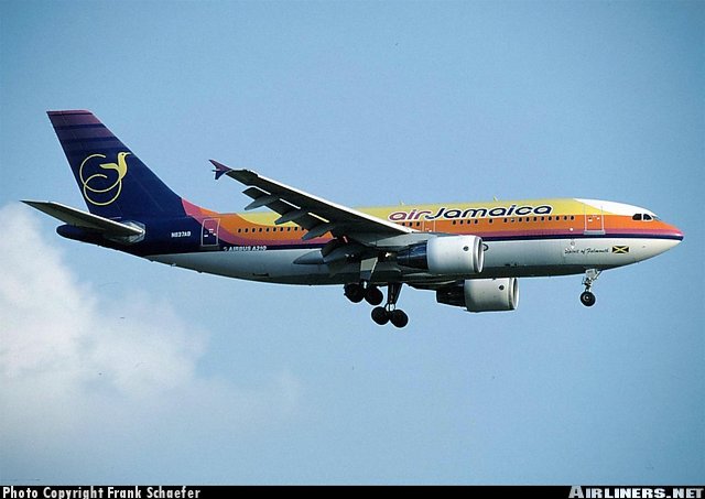 Air Jamaica Airbus A310-324, N837AB, is shown arriving at London Heathrow Airport in 1996.