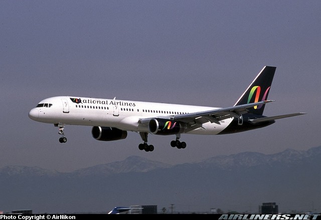 National Airlines Boeing 757-28A, N517NA, is shown arriving at Los Angeles International Airport in February 2001.