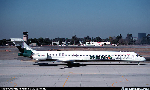 Reno Air McDonnell Douglas MD-90-30, N902RA, "Orange County Flyer," is shown at Orange County in October 1996.