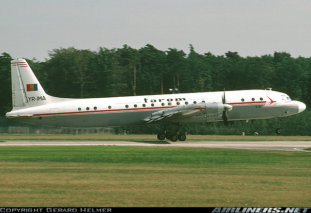 Tarom Ilyushin IL-18V, YR-IMA, is shown at Frankfurt in the early 1980s.