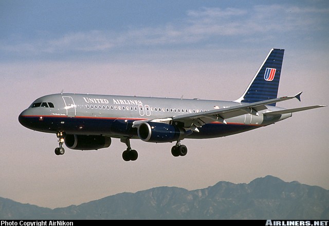 United Airlines Airbus A320-232, N403UA, is shown approaching Los Angles International Airport on February 13, 1999