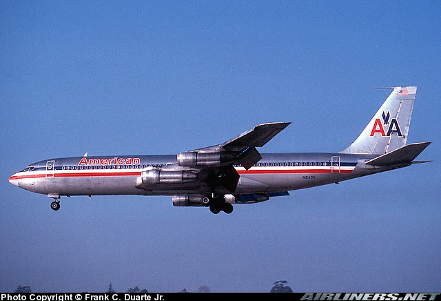 American Airlines Boeing 707-323B, N8438, is shown landing at San Diego in March 1977.