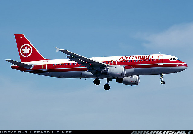 Air Canada Airbus A320-211, C-FGYL, is seen approaching Miami International Airport on January 26, 1992.