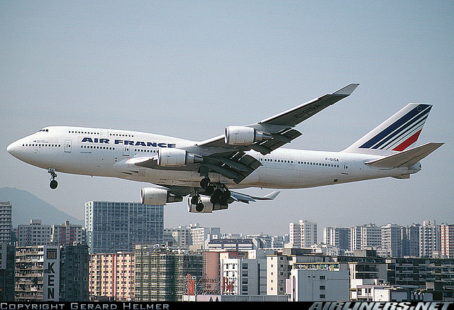 Air France Boeing 747-428M, F-GISA, is shown arriving at Hong Kong on October 1, 1992.