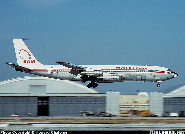 Royal Air Maroc Boeing 707-351C, CN-RMB, is shown arriving at Kennedy International Airport on October 21, 1979.