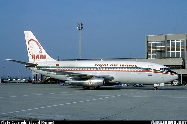 Royal Air Maroc Boeing 737-2B6, CN-RMH, "Oujda," is shown at Basle/Mulhouse in September 1982.