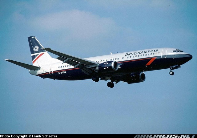 British Airways Boeing 737-4Q8, G-BSNW, is shown arriving at Gatwick Airport in 1996.