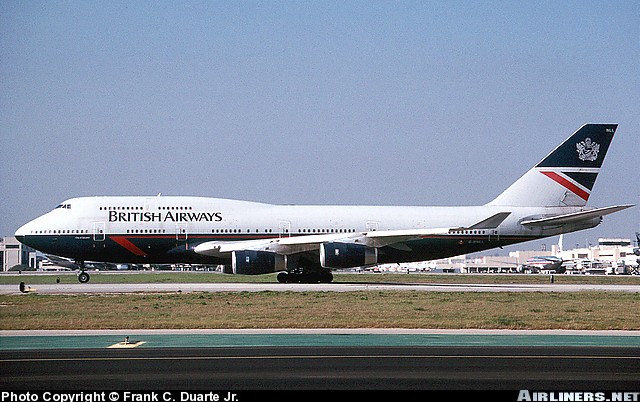 British Airways Boeing 747-436. G-BNLL, "City of Leicester," is shown at Los Angeles International Airport in July 1996.