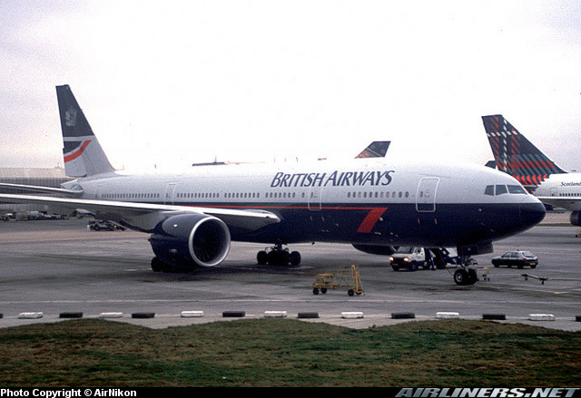 A British Airways Boeing 777-236/ER is shown at Heathrow Airport in December 1999.