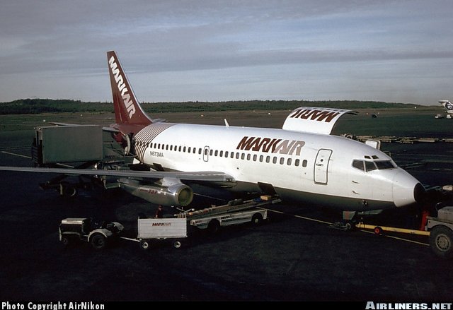 Markair Boeing 737-2X6C, N673MA, is shown at Anchorage in August 1985.
