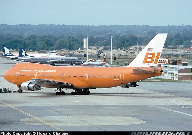 Braniff International Airways Boeing 747-127, N601BN, is shown at London Gatwick Airport on July 27, 1978.