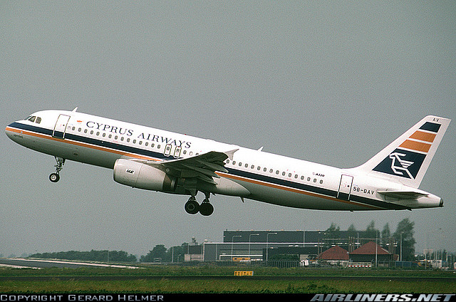 Cyprus Airways Airbus A320-231, 5B-DAV, is shown departing Amsterdam in the late 1990s.
