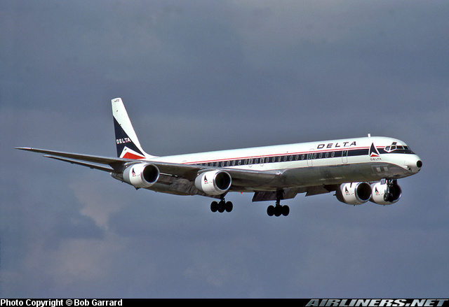 Delta Air Lines McDonnell Douglas DC-8-71, N1340L, is shown approaching Miami in December 1983.