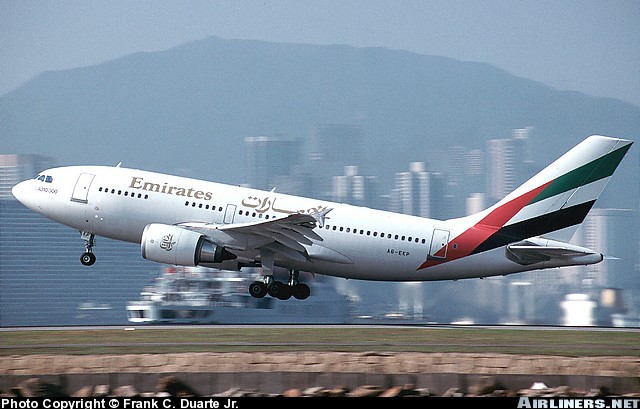 Emirates Airbus A310-308, A6-EKP, is shown departing Hong Kong's Kai Tak Airport in October 1996.