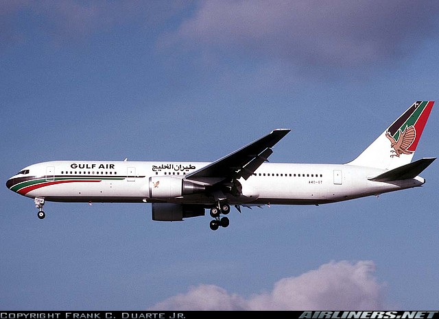 Gulf Air Boeing 767-3P6/ER, A4O-GT, "Al Wakrah," is shown arriving at Frankfurt in April 1993.