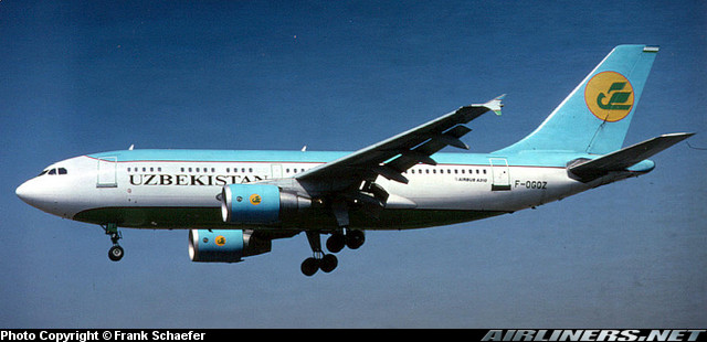 Uzbekistan Airways Airbus A310-324, F-OGQZ, is shown arriving at London Heathrow in July 1996.