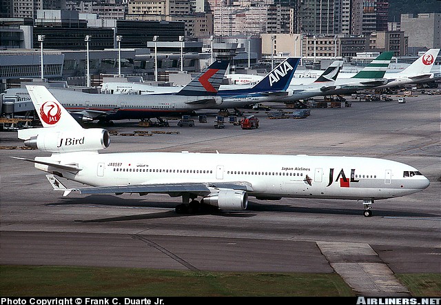 Japan Airlines McDonnell Douglas MD-11, JA8587, is shown at Hong Kong in October 1996.