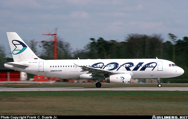 Adria Airways Airbus A320-231, SL-AAA,is shown at Frankfurt in August 1992.