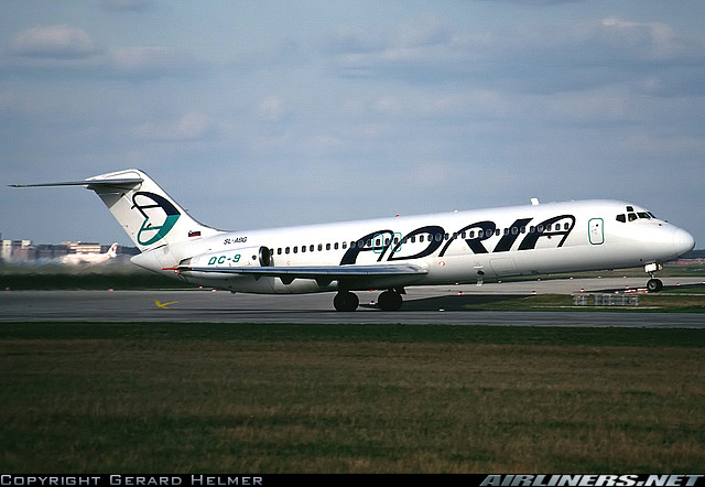 Adria Airways McDonnell Douglas DC-9-33RC, SL-ABG, is shown departing Frankfurt on April 20, 1992.