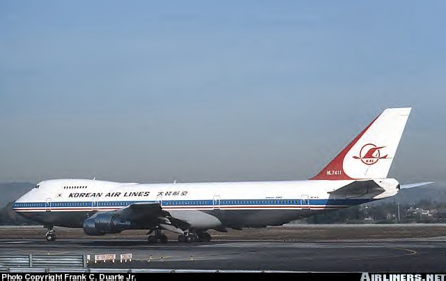 Korean Air Lines Boeing 747-2B5B, HL-7411, is shown at Los Angeles in January 1979.
