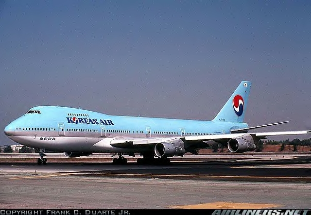 Korean Air Boeing 747-2B5B, HL7454, is shown at Los Angeles in August 1987.