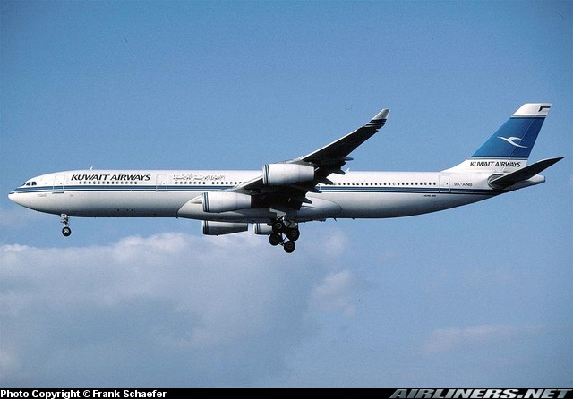 Kuwait Airways Airbus A340-313, 9K-ANB, is shown approaching London Heathrow Airport in 1996.