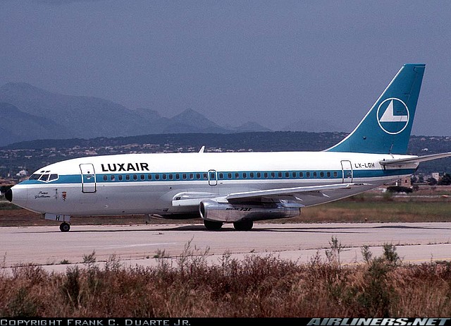 Luxair Boeing 737-2C9, LX-LGH, "Prince Guillaume," is shown Palma de Mallorca in August 1986.