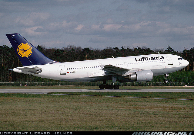 Lufthansa Airbus A310-304, D-AIDC, is shown at Frankfurt on April 19, 1992, wearing the carrier's updated livery.