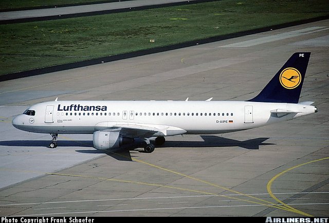 Lufthansa Airbus A320-211, D-AIPE, is shown at Cologne/Bonn in the early 1990s.