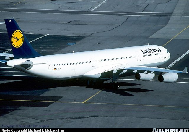 Lufthansa Airbus A340-311, D-AIGH, is shown at Kennedy International Airport on April 26, 1997.