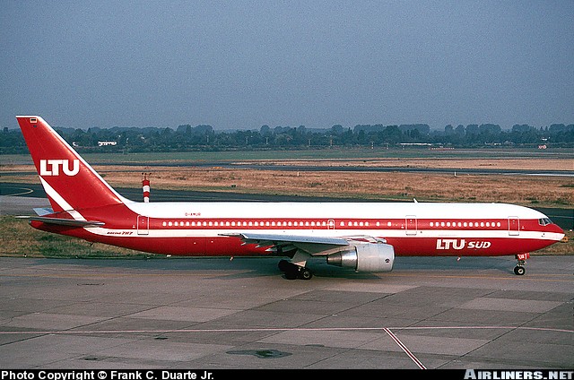 LTU Boeing 767-3G5, is shown at Dusseldorf in January 1996.