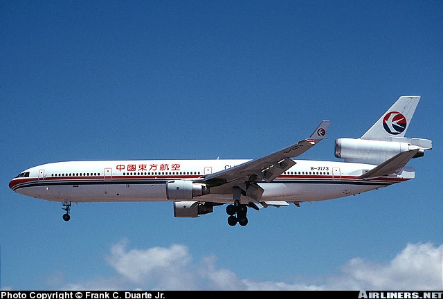 China Eastern Airlines McDonnell Douglas MD-11, B-2173, is shown arriving at Los Angeles International Airport in