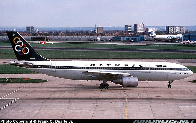 Olympic Airways Airbus A300B4-103, SX-BED, "Telemachus," is shown at London Heathrow Airport in August 1986.
