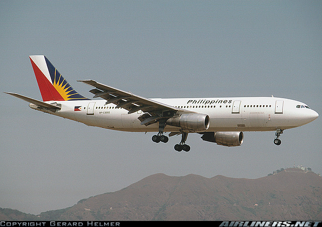 Philippine Airlines Airbus A300B4-103, RP-C3002, is shown arriving at Hong Kong in the early 1990s.
