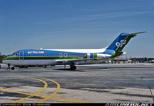Air Florida McDonnell Douglas DC-9-15RC, N73AF, is shown at Miami International Airport in March 1981 wearing updated