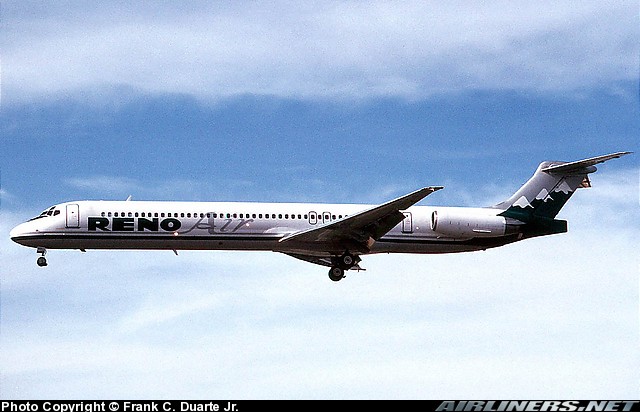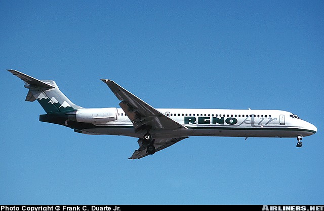 Reno Air McDonnell Douglas MD-82, N832RA, is shown arriving at Los Angeles International Airport in July 1996.
