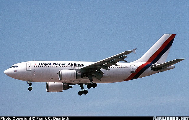 Royal Nepal Airlines Airbus A310-304, D-APON, is shown arriving at Frankfurt in January 1996.