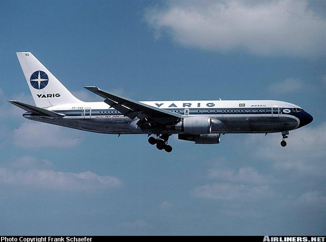 Varig Boeing 767-241/ER, PP-VNQ, is shown arriving at Miami International Airport in the early 1990s.
