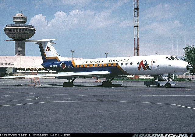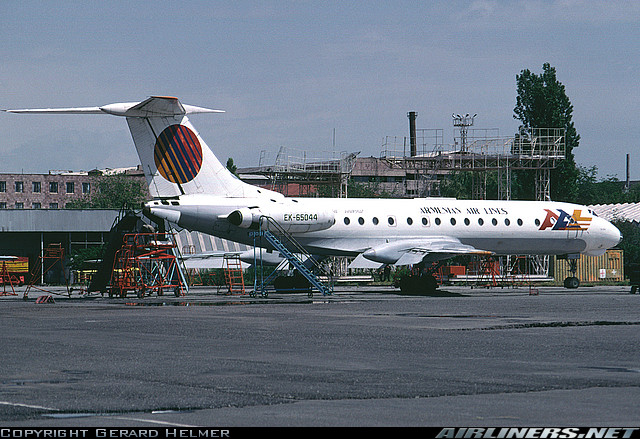 Armenian Airlines Tupolev TU-134A-3, EK-65044, is shown at Yerevan on May 16, 1996 wearing a different livery.