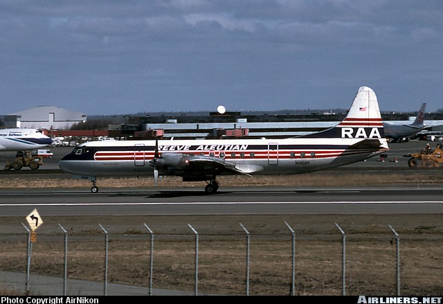 Reeve Aleutian Airways Lockheed L-188C Electra, N1968R, is shown at Anchorage in May 1999.