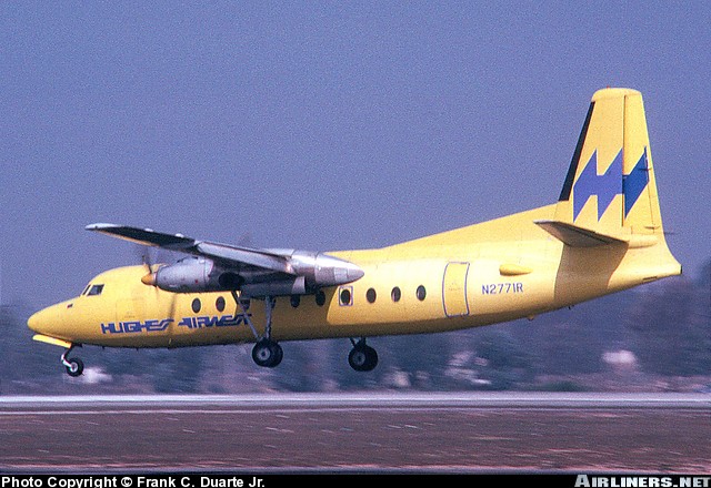 Hughes Airwest Fairchild F-27A, N2771R, is shown landing at Los Angeles in October 1977.