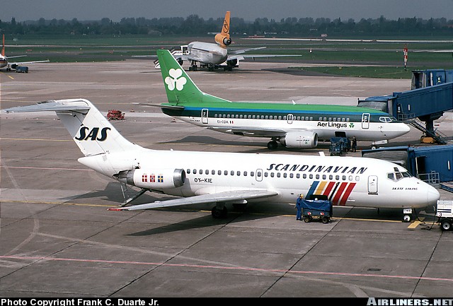 Scandinavian Airlines McDonnell Douglas DC-9-21, OY-KIE, "Skate Viking," is shown at Duesseldorf in August 1992