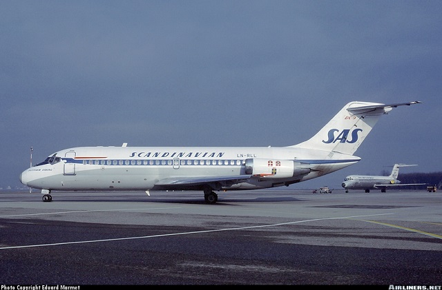 Scandinavian Airlines System McDonnell Douglas DC-9-21, LN-RLL, "Guttorm Viking," is shown at Basel/Mulhouse